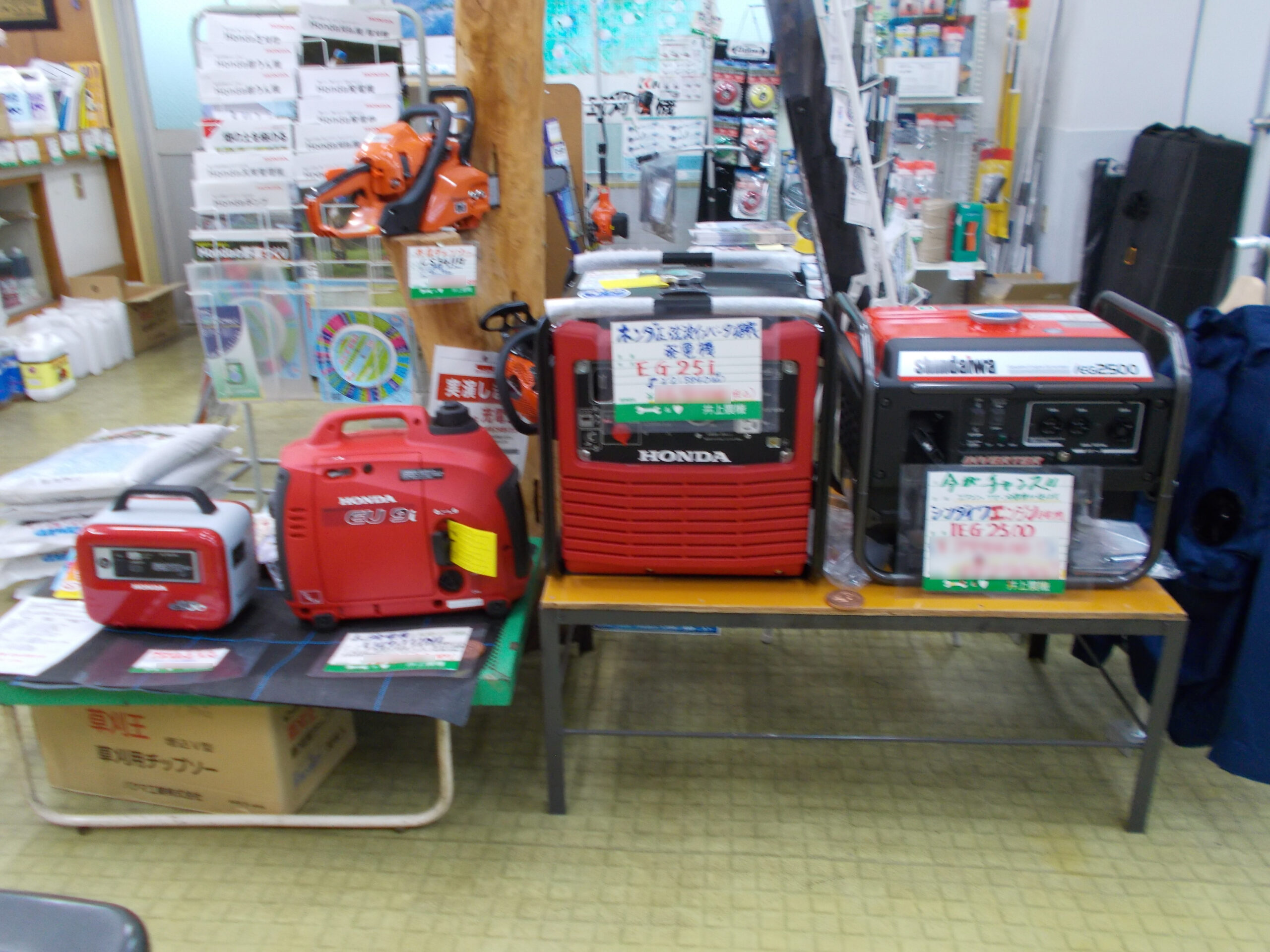 取り扱いがシンプルなチェンソーやプロの方に向いた馬力があるチェンソー、刈払機などいろいろ並べてあります。